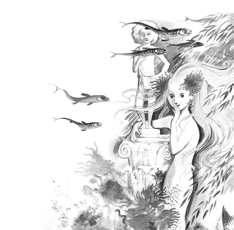 Прошёл ещё год – и вынырнула третья сестра. Эта была смелее всех и поплыла в широкую реку, которая впадала в море. Тут она увидела зелёные холмы, покрытые виноградниками, дворцы и дома, окружённые красивыми рощами, в которых пели птицы. Солнце светило ярко и так припекало, что ей не раз пришлось нырнуть в воду, чтобы освежить пылающее лицо. В маленькой бухте плескалась целая толпа голеньких человеческих детей. Русалка хотела было поиграть с ними, но они испугались и убежали, а вместо них появился какой-то чёрный зверёк и принялся на неё тявкать, да так грозно, что она в страхе уплыла. Зверёк этот был просто-напросто собачкой, но русалка ведь ещё не видела собак. Вернувшись домой, она не переставала вспоминать чудесные леса, зелёные холмы и прелестных детей, которые умели плавать, хоть у них и не было рыбьих хвостов.