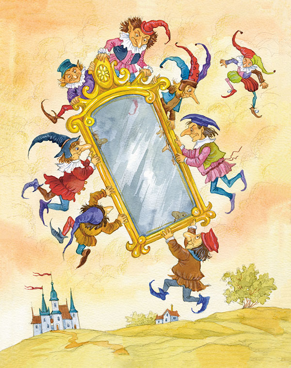 Жил-был тролль, злой-презлой – сущий дьявол! Как-то раз он был в особенно хорошем настроении, потому что смастерил зеркало, отражаясь в котором, всё доброе и прекрасное почти исчезало, а всё плохое и безобразное, напротив, бросалось в глаза и казалось ещё отвратительней. Красивейшие виды, отразившись в нём, казались варёным шпинатом, а лучшие из людей – уродами; или же чудилось, будто люди эти стоят вверх ногами, а живота у них вовсе нет! Лица в этом зеркале искажались до того, что их нельзя было узнать, а если у кого на лице сидела веснушка, она расплывалась во весь нос или щёку. Тролля всё это очень потешало. Когда человеку приходила в голову добрая, хорошая мысль, зеркало тотчас строило рожу, а тролль не мог удержаться от хохота, так он радовался своей забавной выдумке. Ученики тролля – а у него была своя школа – рассказывали о зеркале как о каком-то чуде.