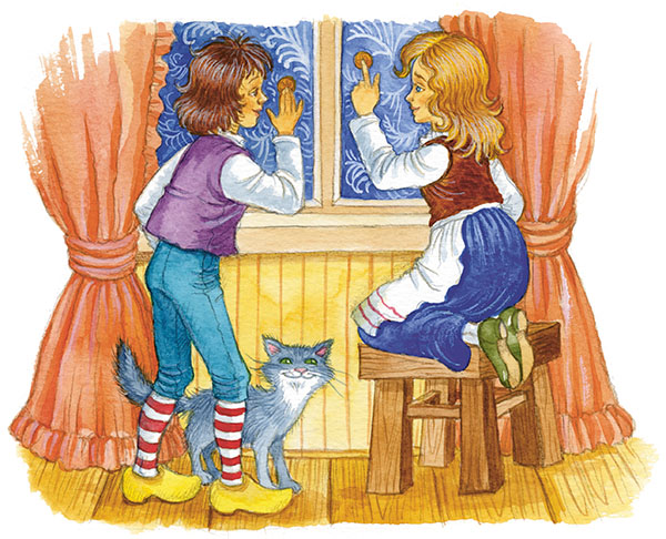 Зимою это удовольствие прекращалось. Окна часто замерзали, но дети нагревали на печке медные монеты и прикладывали их к обмёрзшим стёклам; лёд быстро оттаивал, появлялось чудесное окошечко – такое круглое-круглое, – и в нём показывался весёлый, ласковый глазок: это переглядывались мальчик и девочка, Кай и Герда. Летом они одним прыжком могли попасть друг к другу, зимою же надо было сначала спуститься на много-много ступенек, затем подняться на столько же. А на дворе завывала метель.