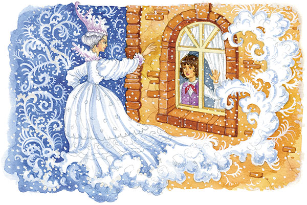 В тот вечер, когда Кай вернулся домой и уже почти совсем разделся перед сном, он вскарабкался на стул у окна и стал смотреть сквозь круглое окошечко в том месте, где лёд на стекле оттаял. За окном порхали снежинки; одна из них, очень крупная, упала на край цветочного ящика и вдруг начала расти. Росла-росла, пока наконец не превратилась в женщину, закутанную в тончайший белый тюль, который, казалось, был соткан из миллионов снежных звёздочек. Женщина эта, необычайно прекрасная, была вся изо льда, из ослепительного, сверкающего льда! И, однако, живая! Глаза её сияли как звёзды, но в них не было ни тепла, ни мира. Она кивнула мальчику и поманила его рукой. Мальчуган испугался и спрыгнул со стула, а мимо окна промелькнуло что-то похожее на большую птицу.