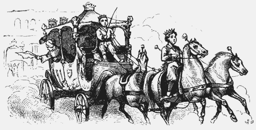 Ей дали и башмаки, и муфту, и чудесное платье, а когда она простилась со всеми, к воротам подъехала золотая карета с сияющими, как звёзды, гербами принца и принцессы; у кучера, лакеев и форейторов – ей дали и форейторов – красовались на головах маленькие золотые короны. Принц и принцесса сами усадили Герду в карету и пожелали ей счастливого пути. Лесной ворон, который уже успел жениться, провожал девочку первые три мили и сидел в карете рядом с нею, – он не мог ехать к лошадям спиною. Ручная ворона сидела на воротах и хлопала крыльями. Она не ехала провожать Герду, потому что страдала головными болями с тех пор, как получила должность при дворе и слишком много ела. Карета битком была набита сахарными крендельками, а ящик под сиденьем – фруктами и пряниками.
