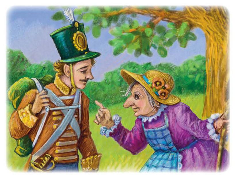 Шёл солдат по дороге: раз-два! раз-два! Ранец за спиной, сабля на боку; он шёл домой с войны. На дороге встретилась ему старая ведьма – безобразная, противная: нижняя губа висела у неё до самой груди.