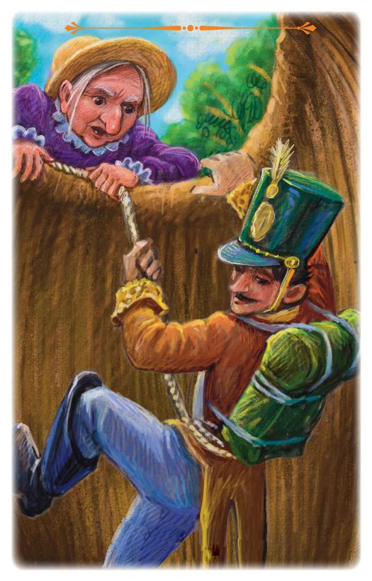 – Видишь вон то старое дерево? – сказала ведьма, показывая на дерево, которое стояло неподалёку. – Оно внутри пустое. Влезь наверх, там будет дупло, ты и спустись в него, в самый низ! А перед тем я обвяжу тебя верёвкой вокруг пояса, ты мне крикни, и я тебя вытащу.