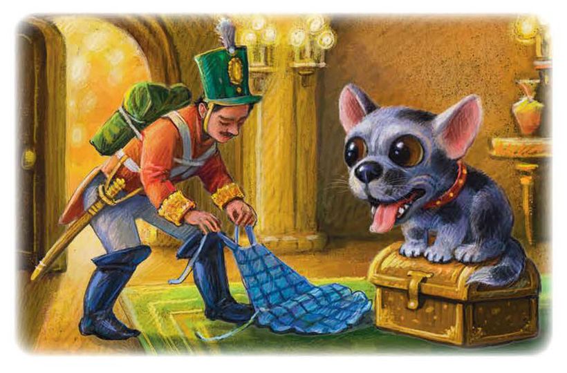 – Нечего тебе таращиться на меня, глаза заболят! – сказал солдат и посадил собаку на ведьмин перед ник. Увидев в сундуке огромную кучу серебра, он выбросил все медяки и набил оба кармана и ранец серебром. Затем солдат пошёл в третью комнату. Фу-ты пропасть! У этой собаки глаза были ни дать ни взять две Круглые башни и вертелись, точно колёса.
