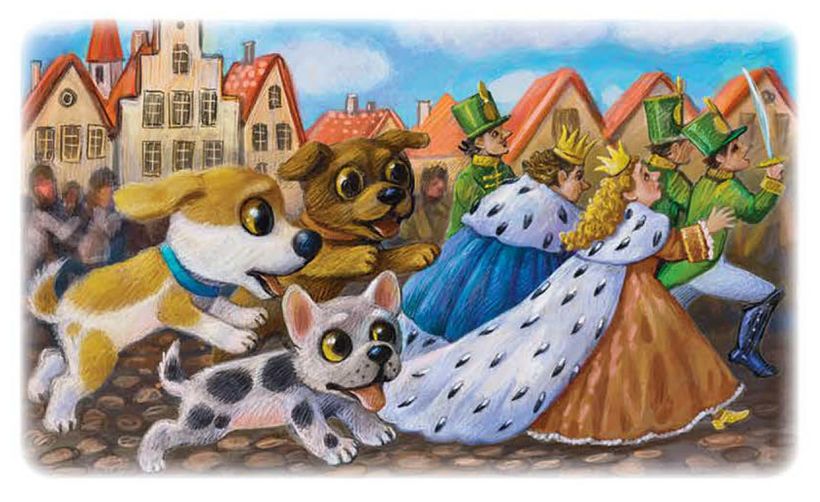 – Не надо! – закричал король, но самая большая собака схватила его вместе с королевой и подбросила их кверху вслед за другими. Тогда солдаты испугались, а весь народ закричал: