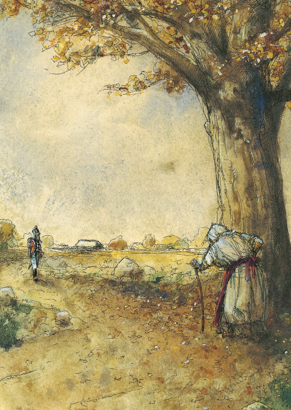 Шёл солдат по дороге: раз-два! раз-два! Ранец за спиной, сабля на боку. Шёл он домой с войны. По дороге встретилась ему старая ведьма, безобразная, противная: нижняя губа висела у неё до самой груди.