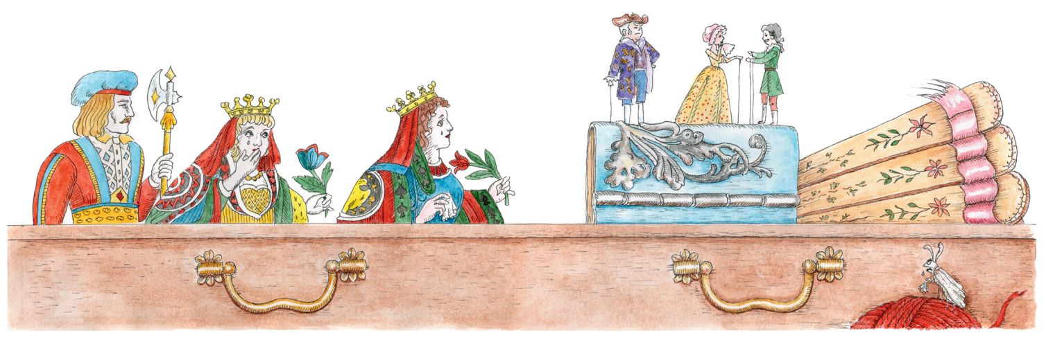 Тут лежали три-четыре неполные колоды карт и кукольный театр; он был кое-как установлен в тесном ящике, и на сцене шло представление. Все дамы – и бубновые, и червонные, и трефовые, и пиковые – сидели в первом ряду и обмахивались своими тюльпанами. Позади них стояли валеты, и у каждого было по две головы – сверху и снизу, как и у всех карт. В пьесе изображались страдания влюблённой парочки, которую разлучали. Пастушка заплакала: это была точь-в-точь их собственная история.