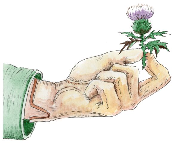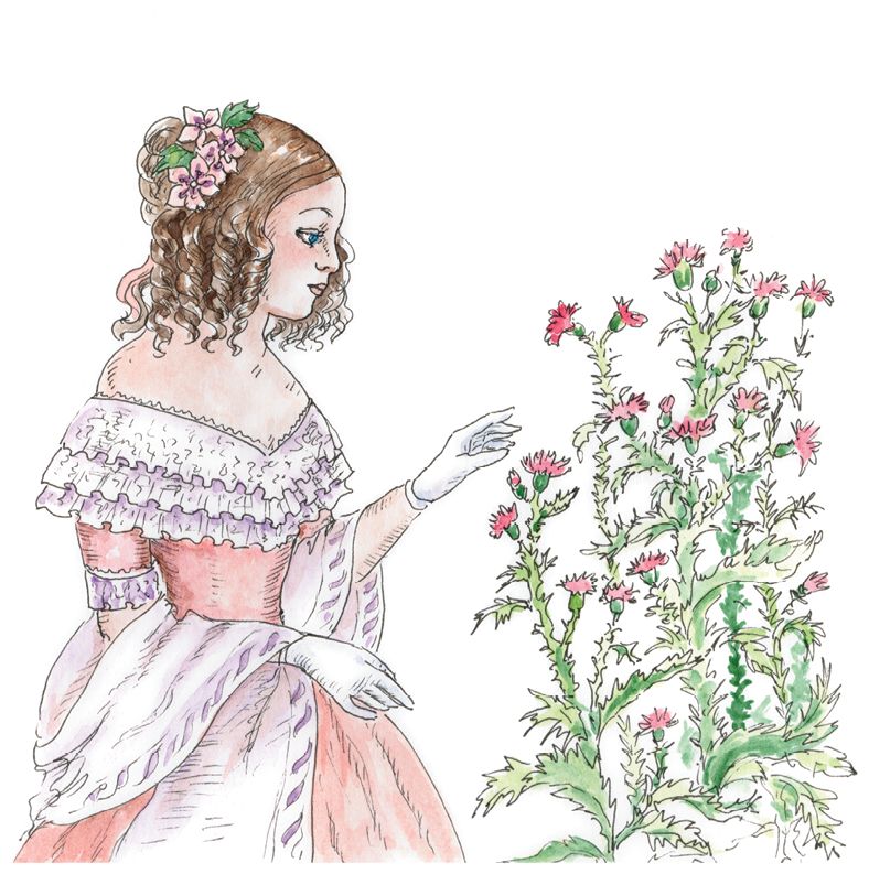 Молодёжь резвилась на лужайке, играла в крокет; затем все отправились гулять по саду; каждая барышня сорвала цветок и воткнула его в петлицу одного из молодых людей. А юная шотландка долго озиралась кругом, выбирала-выбирала, но так ничего и не выбрала: ни один из садовых цветков не пришелся ей по вкусу. Но вот она глянула за решётку, где рос репейник, увидала его иссиня-красные пышные цветы, улыбнулась и попросила сына хозяина дома сорвать ей один из них.