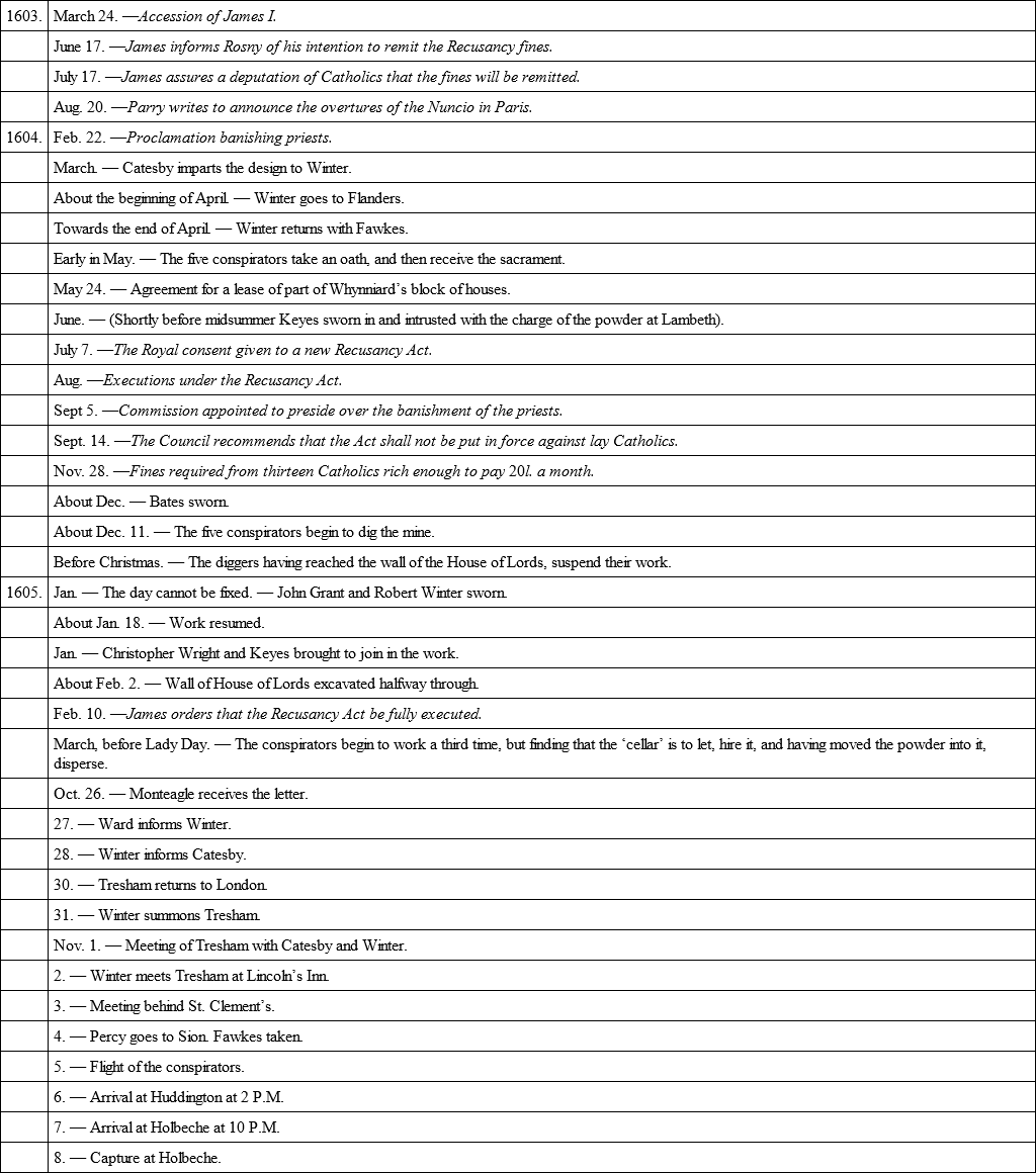 In ‘What was the Gunpowder Plot? The Traditional Story tested by Original Evidence,’1 Father Gerard has set forth all the difficulties he found while sifting the accessible evidence, and has deduced from his examination a result which, though somewhat vague in itself, leaves upon his readers a very distinct impression that the celebrated conspiracy was mainly, if not altogether, a fiction devised by the Earl of Salisbury for the purpose of maintaining or strengthening his position in the government of the country under James I. Such, at least, is what I gather of Father Gerard’s aim from a perusal of his book. Lest, however, I should in any way do him an injustice, I proceed to quote the summary placed by him at the conclusion of his argument: —