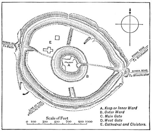 18. The Legend of Arthur.—Thirty-two years passed away after the defeat of the West Saxons at Mount Badon in 520 (see p. 28) before they made any further conquests. Welsh legends represent this period as that of the reign of Arthur. Some modern inquirers have argued that Arthur's kingdom was in the north, whilst others have argued that it was in the south. It is quite possible that the name was given by legend to more than one champion; at all events, there was a time when an Ambrosius, probably a descendant of Ambrosius Aurelianus (see p. 27), protected the southern Britons. This stronghold was at Sorbiodunum, the hill fort now a grassy space known as Old Sarum, and his great church and monastery, where Christian priests encouraged the Christian Britons in their struggle against the heathen Saxons, was at the neighbouring Ambresbyrig (the fortress of Ambrosius), now modernised into Amesbury. Thirty-two years after the battle of Mount Badon the kingdom of Ambrosius had been divided amongst his successors, who were plunged in vice and were quarrelling with one another.