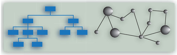 Эти две системные топологии сами по себе не являются исключительными. Совершенно ясно, что организация, описанная как иерархия, не всегда функционирует в соответствии со строго установленными отношениями подчиненности. Сети, даже если они не определены формально, возникают в отношениях между отдельными лицами и группами, которые обеспечивают необходимые элементы и связи для того, чтобы сделать дело. Кроме того, вполне понятно, что отдельные элементы в физической сети, такие, как, например, трансформатор в электросети, являются изделиями, оказывающими услуги, и они были задуманы и разработаны как системы для достижения конкретной цели или удовлетворения конкретной потребности. Эти элементы сами по себе являются системами, которые могут быть подвергнуты декомпозиции, построены и находиться под управлением в соответствии с некоторой иерархией.