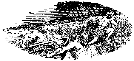 Берег был широким, белый песок слепил, словно снег. Вдали на отмели пенились буруны, разбившиеся валы невысокими волнами катили к берегу. Там, куда уже не мог дотянуться прибой, валялись щепки, изломанные губки, разноцветные раковины, фиолетовые улитки, длинные зеленые пучки водорослей, осыпанные крошечными крабами. Мелкие ветки, принесенные морем, не стоили внимания, и люди направились к холмам, от которых уходил в воду каменистый берег. Легко поднявшись по склону, они увидели в просветах между деревьями уютную бухту. С противоположной стороны на песке нежились какие-то существа – должно быть, тюлени.