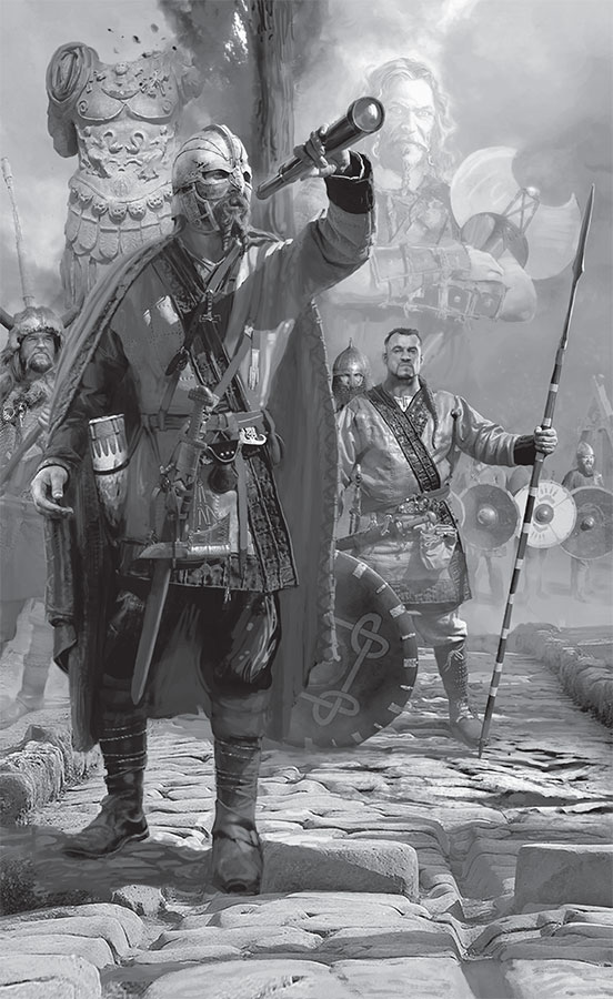 Пение рожков заставило зрителей разбрестись по обе стороны площади, освободив дорогу для вышедших из дворца гостей короля и свиты. Во главе, сразу за отрядом силачей, неистово дующих в сохранившиеся с незапамятных времен гигантские рога зубров, с нарочитой церемонностью выступали два короля – Шеф и Альфред Саксонский. Те, кто не видел их прежде, смотрели на разительно контрастирующие фигуры и замирали в недоумении: кто же из двоих полновластный монарх, а кого только терпят в качестве соправителя, – пока более осведомленный сосед не шептал на ухо подсказку. И действительно, Альфред в своих царственных одеждах выглядел как настоящий монарх: алый плащ поверх небесно-голубой котты, золотой венец на светлых волосах, левая рука величаво возложена на золотую рукоять старинного меча.