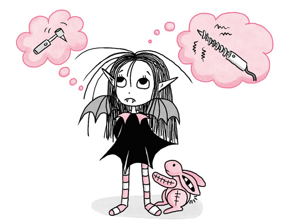 Я в ужасе уставилась на папу. Поход к вампирскому стоматологу вовсе не казался мне «прекрасным поводом побыть вместе». Я тут же вообразила себе груду острых блестящих инструментов, леденящий душу визг бормашины… и меня чуть не затошнило от страха.