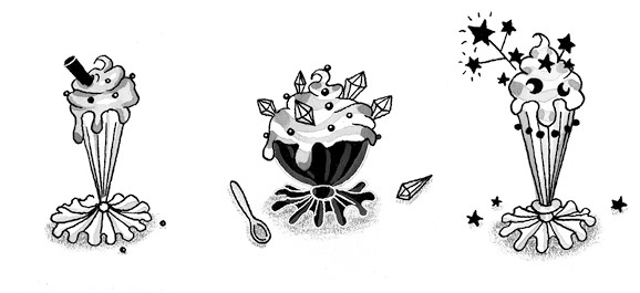 После обеда, отправив свои письма с заявками, Селестина направилась в «Лунный лёд», по дороге встретившись в центре Бурьянного округа с Тишкой и Твилой. Они вместе долго стояли перед витриной с мороженым всех цветов радуги, которое охлаждалось заморозными чарами, и Селестина подумала, что выбирать мороженое и предвкушать удовольствие от него даже приятнее, чем есть. В конце концов она выбрала себе ореховое, Тишка – «гоблинские слёзки», а Твила – малиновое, присыпанное мармеладными самоцветиками. Торжественно неся перед собой вазочки с высокой горкой мороженого, они уселись за один из тонконогих столиков на веранде.