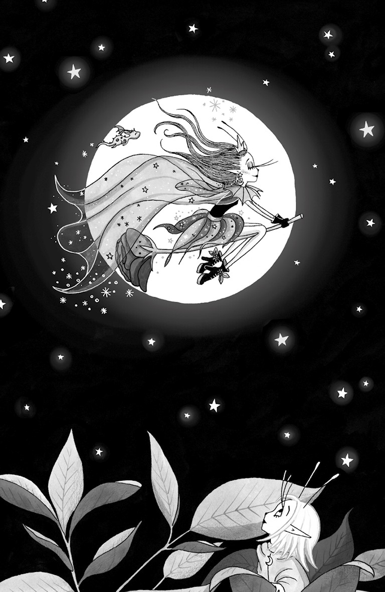 Селестина и сама не заметила, как так получилось, что она уже мчится сквозь ночь за Викторией-Стич, стараясь держаться как можно ближе к шелестящей листве деревьев, скрывая мерцающие следом за её цветком лютика золотистые искорки. Сердце её колотилось как никогда, а антенны так и светились от её собственной отчаянной смелости. Держась как можно дальше позади, чтобы сестра её не заметила, она зачарованно следила за её полётом высоко-высоко в усыпанном звёздами небе и развевающейся за её спиной прозрачной мерцающей мантией, чуть отливающей розовым в свете малиново-красной луны.