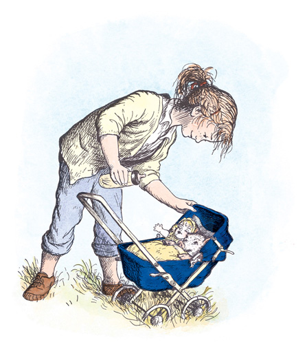Every morning after breakfast, Wilbur walked out to the road with Fern and waited with her till the bus came. She would wave goodbye to him, and he would stand and watch the bus until it vanished round a turn. While Fern was in school, Wilbur was shut up inside his yard. But as soon as she got home in the afternoon, she would take him out and he would follow her round the place. If she went into the house, Wilbur went too. If she went upstairs, Wilbur would wait at the bottom step until she came down again. If she took her doll for a walk in the doll carriage, Wilbur followed along. Sometimes, on these journeys, Wilbur would get tired, and Fern would pick him up and put him in the carriage alongside the doll. He liked this. And if he was very tired, he would close his eyes and go to sleep under the doll’s blanket. He looked cute when his eyes were closed, because his lashes were so long. The doll would close her eyes, too, and Fern would wheel the carriage very slowly and smoothly so as not to wake her infants.