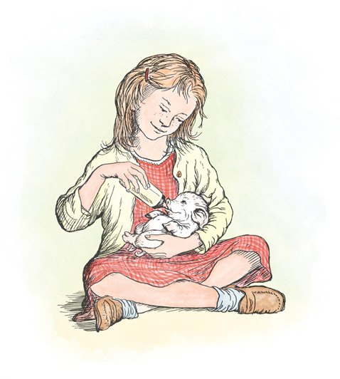 A minute later, Fern was seated on the floor in the corner of the kitchen with her infant between her knees, teaching it to suck from the bottle. The pig, although tiny, had a good appetite and caught on quickly.