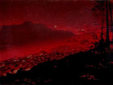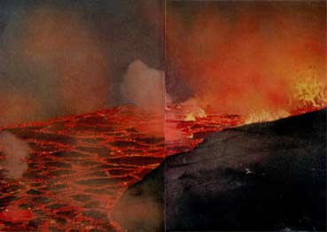 Я наконец увидел тот таран, от ударов которого сотрясалась земля на площади 10 000 квадратных метров. Это была лава. Разбрасывая искры, она тяжело билась о стенки огненного колодца; меня качало и трясло, как тростинку, которую треплет буря.