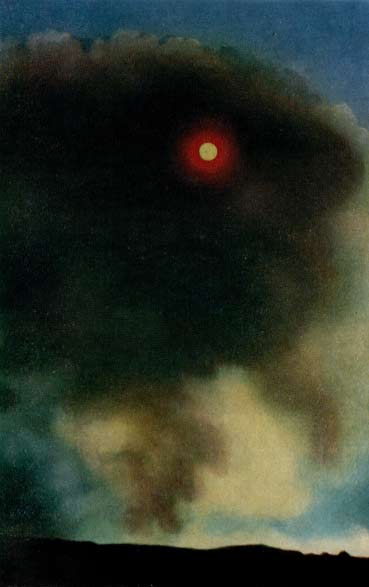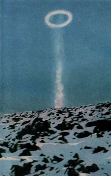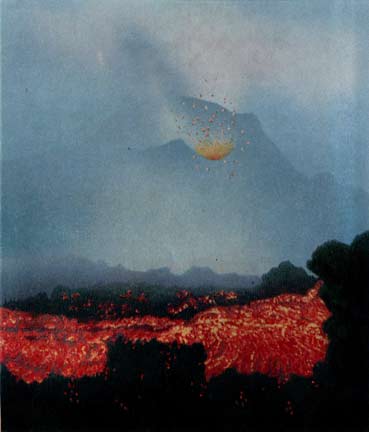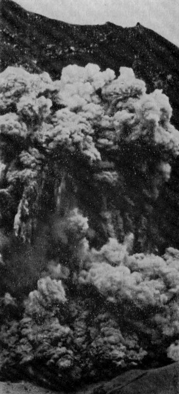 Первая фаза извержения (типа Вулькано). Приблизительная глубина кратера 300 метров. Сгустки, подобные цветной капусте,– раскаленные газы, насыщенные пылью, в них таятся вулканические бомбы