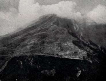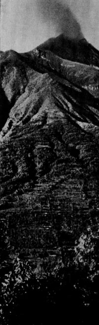 Вид с севера на вулкан Мерапи (Ява), известный частыми и губительными извержениями. Высота вулкана 2911 метров