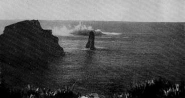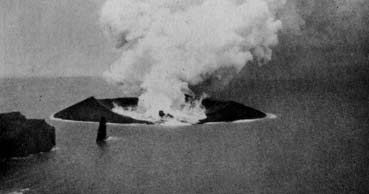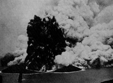 При подводном извержении кратер постоянно сообщается с морем, и даже после появления острова, впоследствии ставшего полуостровом, извержения по-прежнему сохраняли характер подводных взрывов. Взрывы эти бесшумны (гул их гасится водой, которая устремляется в пасти кратера). Мощные выбросы пемзы и черного пепла взметаются на высоту 400—1200 метров. Пепел осаждается затем в море; белые клубы пара поднимаются от поверхности моря, где кипят и испаряются огромные массы воды