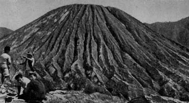 При первом спуске в кратер Бромо нам удалось добраться до самого дна; оно лежит на 250 метров ниже края кратера (август 1956 года). Фото Т. Зена