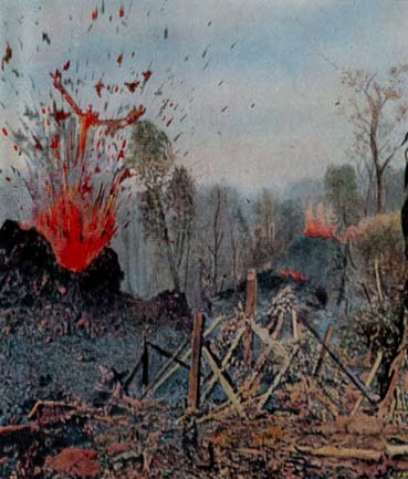 Шаг за шагом продвигался я, прощупывая зыбкую почву; ее куда ярче освещало алое дымное зарево, чем жалкий луч электрического фонарика. Внезапно меня ввергло в оцепенение потрясающее извержение. Да, именно потрясающее, потому что теперь оно было совсем близко! Грохот раздался одновременно с мощной вспышкой света. Верный себе, вулкан выбрасывал лаву в направлении, противоположном моей трассе. Узкий огненный султан озарил южное небо. Затем он угас, и тотчас же посыпались бомбы. Я видел, как по ту сторону жерла падали, мгновенно расплющиваясь, огромные красные комья.
