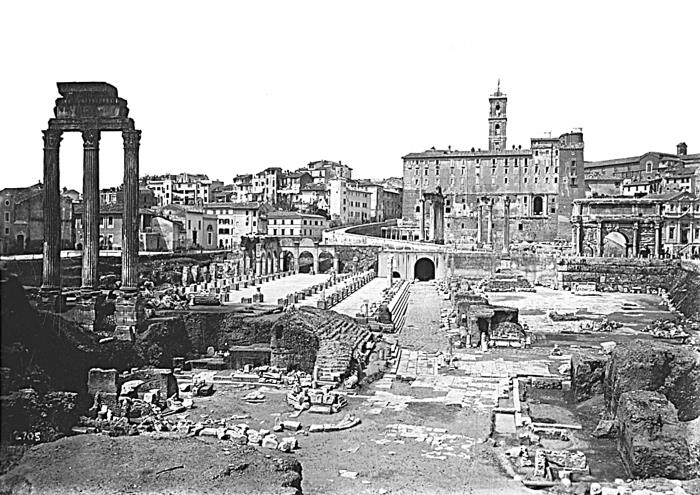 Путешественников, посещающих Рим, все манит заниматься преимущественно античным миром; античный мир выиграл всего больше от событий 1870 г.[5] Новое правительство многим обязано было античным воспоминаниям; доказывая, что Рим достоин быть свободным и располагать собой, что Италия имеет право сделать его своей столицей, охотно опирались на историю республики и империи, постоянно говорили о Сенате, о Форуме и Капитолии, и современные требования много выигрывали от покровительства этих великих имен. Это долг, который итальянское правительство приняло на себя по отношению к прошлому и который начало выплачивать, утвердившись в Риме. 8 ноября 1870 г. было учреждено правительственное заведование раскопками в столице и провинции и во главе его поставлен искусный исследователь Палатинского холма, Пьетро Роза[6]. Через неделю после этого начались раскопки Форума.