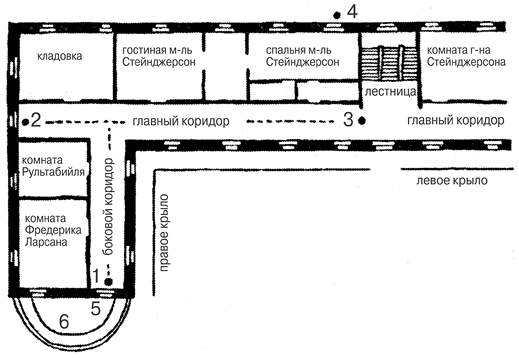 Для пущей ясности рассказа отрезок коридора от лестницы до западного окна я стану в дальнейшем называть «главным коридором», а его отрезок за поворотом – «боковым коридором». Комната Рультабийля находилась сразу за поворотом, за нею располагалась комната Фредерика Ларсана. Двери этих комнат выходили в боковой коридор, двери же комнат, занимаемых мадемуазель Стейнджерсон, – в главный (см. план).