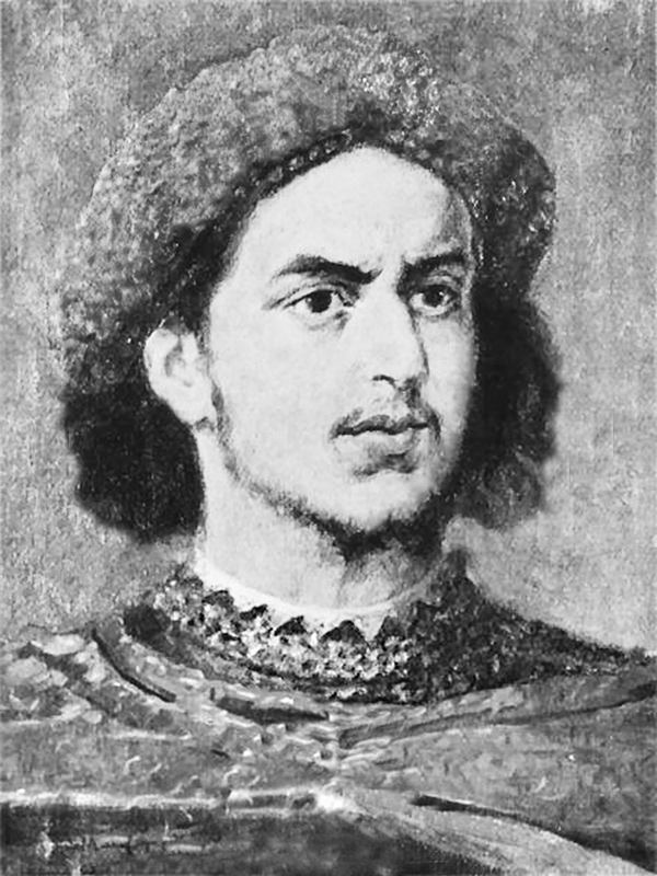 По левую сторону, у самого кресла княжеского, сидел на низкой скамейке человек среднего роста, с выразительной и крайне энергичной физиономией. Одежда его была скромна и проста сравнительно со всеми придворными. Длинный охабень, вроде халата из белой шерстяной материи, обшитый зелёным сукном, с зелёным же широким поясом, довершал его костюм; он держал в руках тонкий длинный жезл, на котором виднелся тройной крючок.