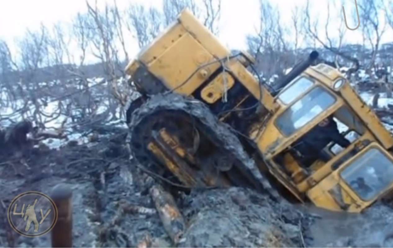 Потопление трактора в болоте на сейсмическом профиле в тайге .