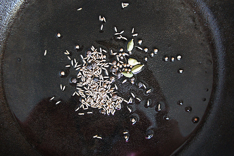 Поджарьте специи на гхи.