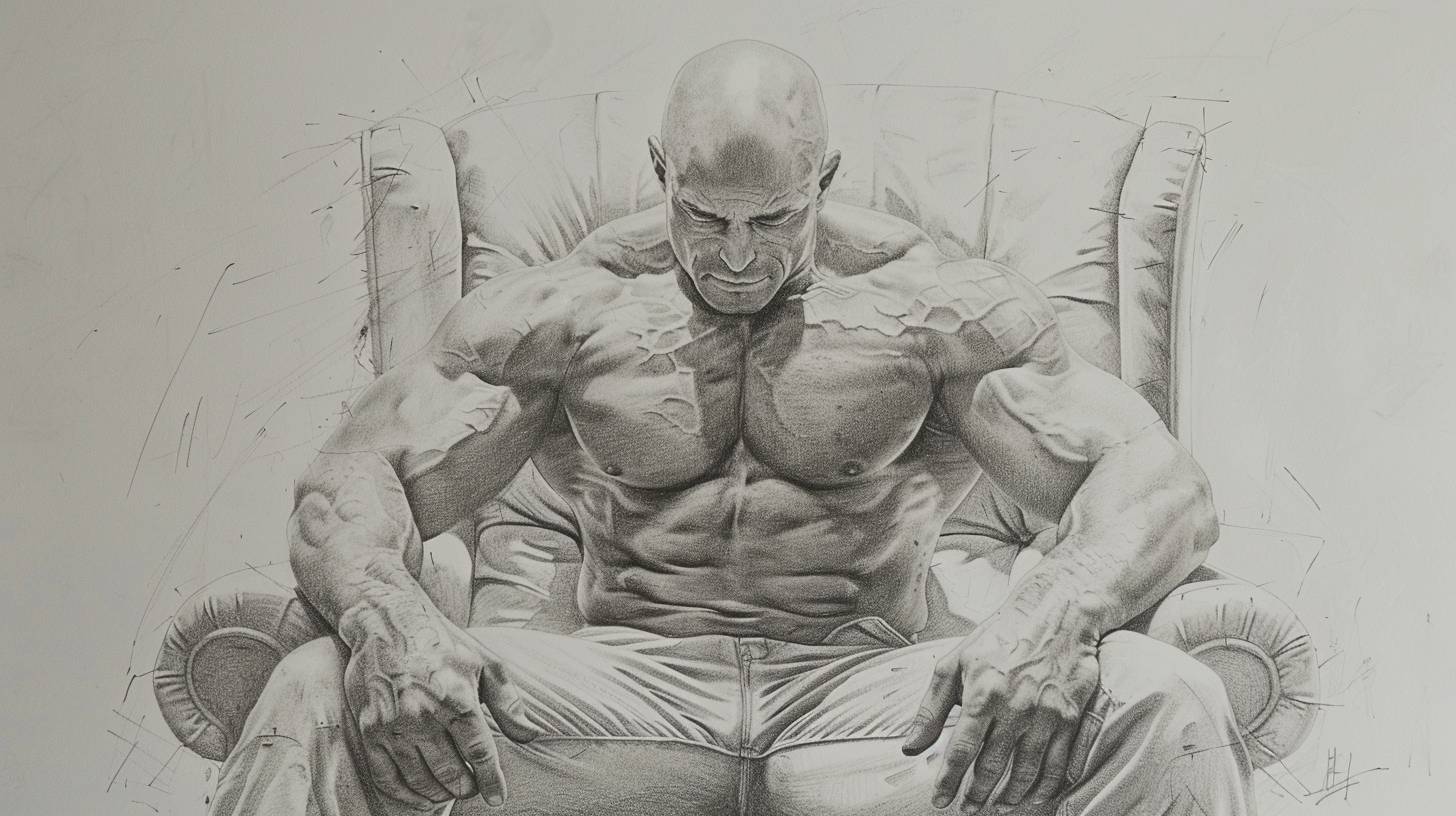 В гостиной, на старом кресле с потрескавшимися лакированными боками сидел могучий, мускулистый мужчина. Он был совершенно голым, а мышцами запросто мог посоперничать с любым атлетом золотой эры бодибилдинга. Широкая грудь, блестящая от пота, мерно вздымалась в такт дыханию. Здоровенный член в полной боеготовности угрожающе покачивается. Стеклянные глаза мужчины равнодушно смотрят на Георгия.