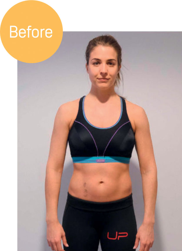 So, on day one of the plan, I put my leggings and crop top on and looked in the mirror. I took the top photo opposite (taking progress photos is part of the programme; see here) and thought, ‘Right, this is how you look now. You’ve had 32 years on these feet, these legs, looking how you do, feeling how you do. Now it’s just 12 weeks to see where it can go and what you can do!’ I really psyched myself up for it, getting into the mindset of an athlete before a fight.