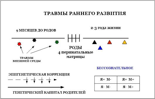 На этапе раннего развития реализуются генетические программы, формируется организм, в индивидуальном бессознательном, фиксируются следы многих эмоциональных, механических, химических, психологических травм [28, 49]. Уже при эмбриональном и внутриутробном развитии травмы также отражаются в бессознательном, а при самом процессе рождения по С. Гроффу, «четыре перинатальные матрицы» тоже фиксируются в бессознательном ребёнка [92].