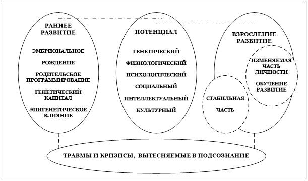 На этапе раннего развития реализуются генетические программы, формируется организм, сознание, а в индивидуальном бессознательном могут фиксироваться следы эмоциональных, механических, химических, психологических травм [49]. При эмбриональном и внутриутробном развитии, которое происходит в биологически комфортной среде, в реальных условиях также возможны травмы из внешней среды, которые фиксируются в бессознательном [28]. Четыре перинатальные матрицы, которые формируются при рождении, также отражаются в бессознательном [28]. Родительское программирование [50] формирует стереотипы и структурирует систему поведенческих реакций взрослого человека [49].