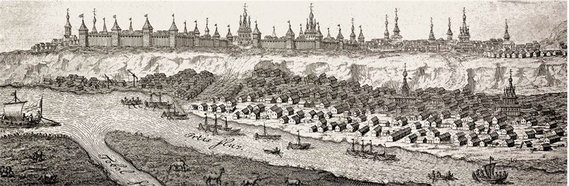 В Тобольске велось следственное дело «О противностях Ильи Нашивошникова с товарищи» Фрагмент гравюры с изображением Тобольска и русских судов на реках Тобол и Иртыш. Из книги „Tree Years Land-Travels of His Excellency Eysbrant Ides from Mosco to China“ (London, 1705)