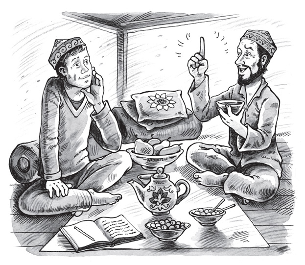 – Уважаемый, – еле сдерживая смех, сказал наблюдавший эту весёлую сцену Ходжа, – поднимись ко мне, я угощу тебя сушёным инжиром, жена подаст нам чай, и ты не спеша поведаешь, что привело тебя к моему скромному очагу.