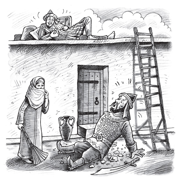 – Как же, – проворчала жена Насреддина, – спустит он тебе лестницу! Я каждый день проедаю ему плешь, чтобы починил сломанные перекладины. И всё без толку. Так что карабкайся на дувал! Ну что ты смотришь на меня? Карабкайся на этот забор! С него легко взобраться на крышу, где этот бездельник прохлаждается весь день, вместо того чтобы заниматься делами, которых в доме невпроворот.