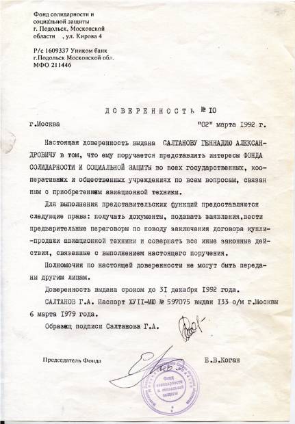 • Доверенность производителя авиатехники Доверителю (ген. директора, авиаконструктора).