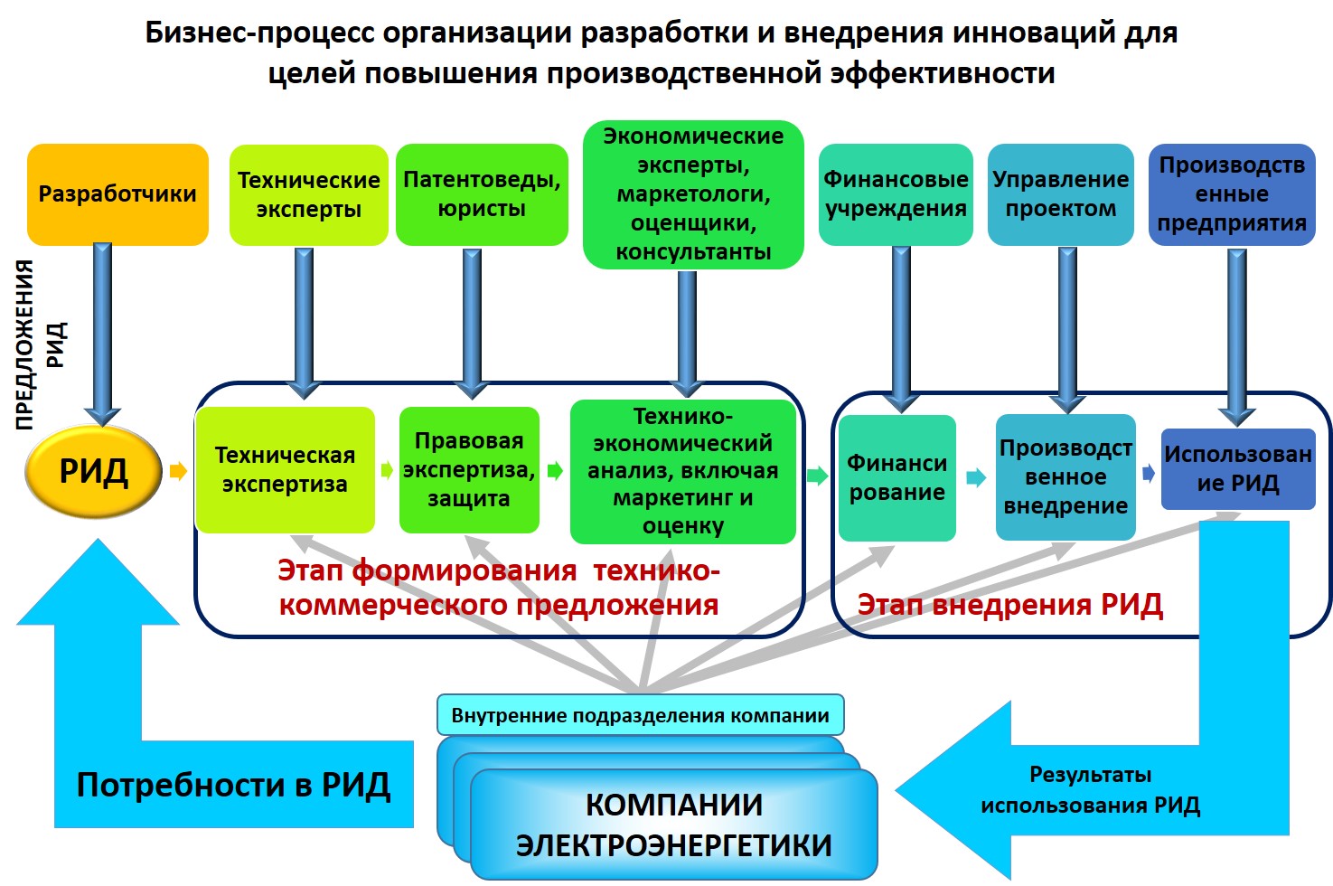 «Одной из целей реформы электроэнергетики является создание условий и заинтересованности в инновационной деятельности, как в технической, так и в организационно-управленческой сфере, позволяющих повысить эффективность энергокомпаний. Важнейшим фактором успешной реализации этой задачи является организация современной рыночно-ориентированной системы управления процессами создания и использования результатов интеллектуальной деятельности (далее РИД)».