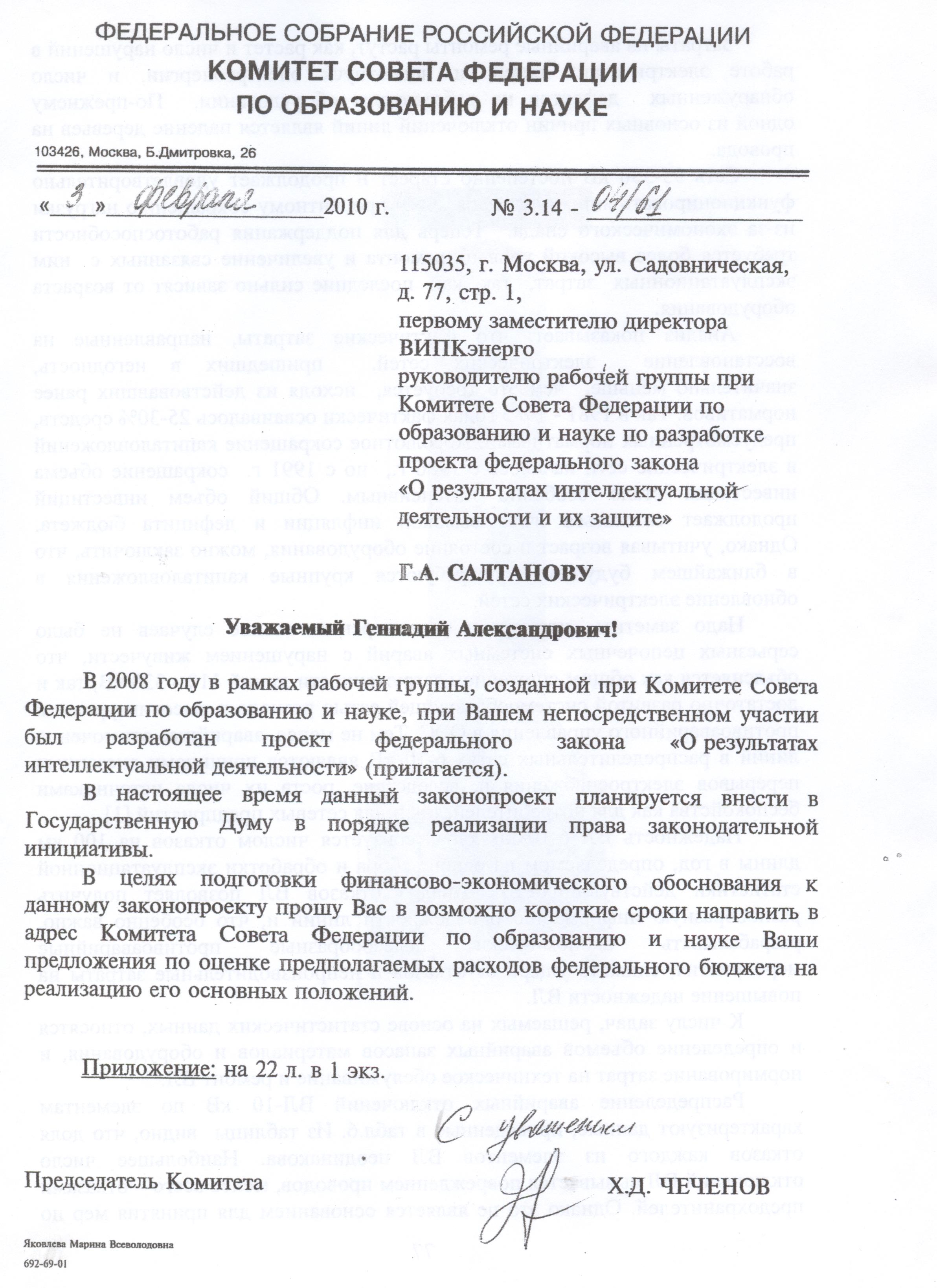 В соответствии с функционалом Рабочей группы Комитета СФ РФ развиваются и работы в области законотворчества. Председателем Комитета по образованию и науке Чеченовым Х.Д. совместно с нашей экспертно-консультативной поддержкой был инициирован ряд законопроектов. Одним из наиболее значимых на тот момент был проект Федерального закона «О результатах интеллектуальной деятельности». В рамках НИР по заказу Совета Федерации РФ разработка законопроекта была поручена Рабочей группе. Созданная команда (принцип 6) работала напряженно и активно, ее участники имели большой опыт в области разработок различных законопроектов и нормативных актов (например – Томчин Григорий Алексеевич – депутат ГД РФ, экс-председатель Комитета ГД РФ по экономической политике и предпринимательству).