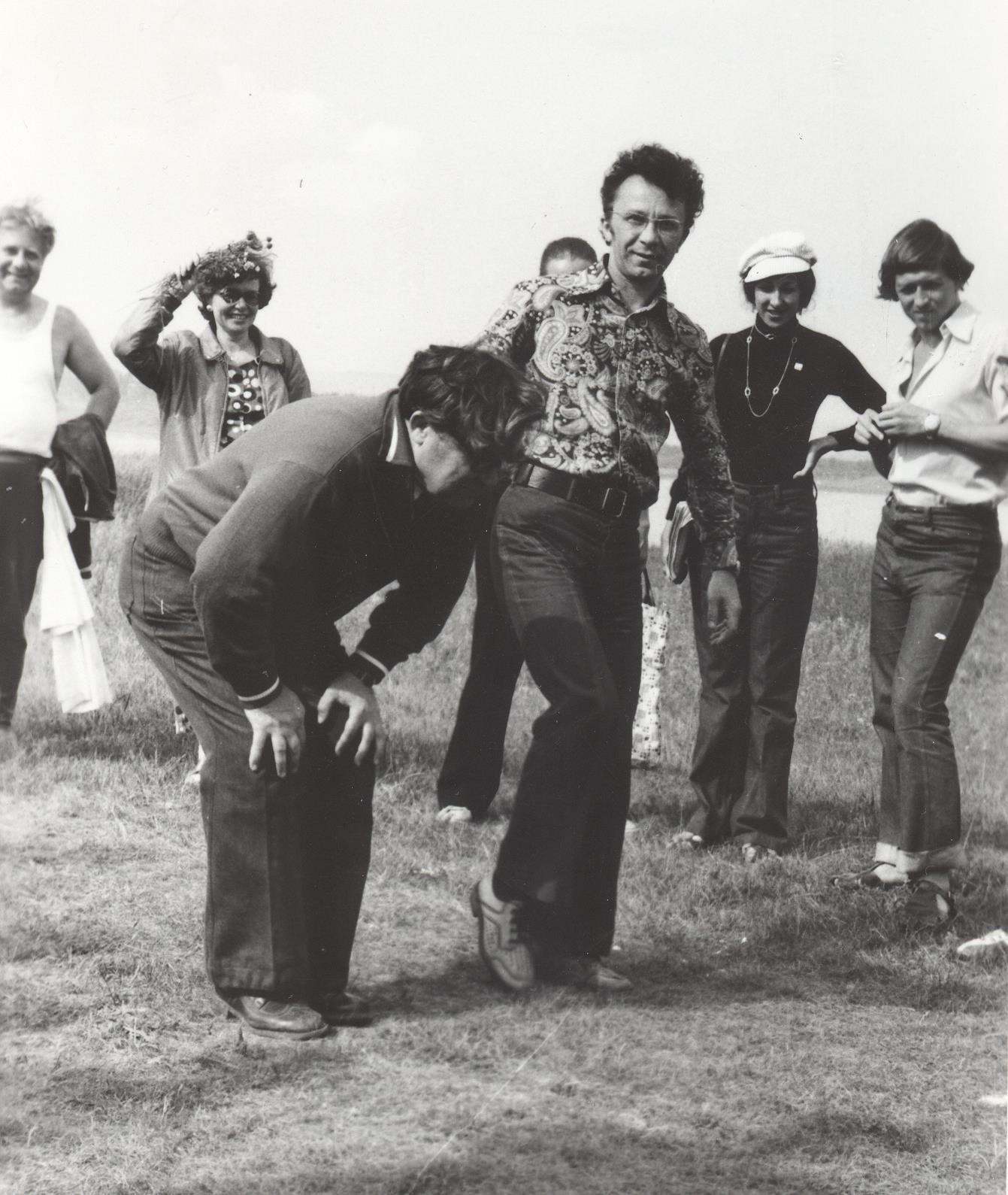 Творческая, абсолютно неформальная и дружеская атмосфера общения, включая соревнования, например по прыжкам в длину с места. Показательный факт – академик Самарский А.А., бывший фронтовик, инвалид (что-то с левой ногой) принял участие с условием, что все прыгают только на одной ноге (см. знаменитое фото – прыжки в длину, тренер – автор этих строк, инициатор – заводила, Роберт Нигматулин. (рис. 5)