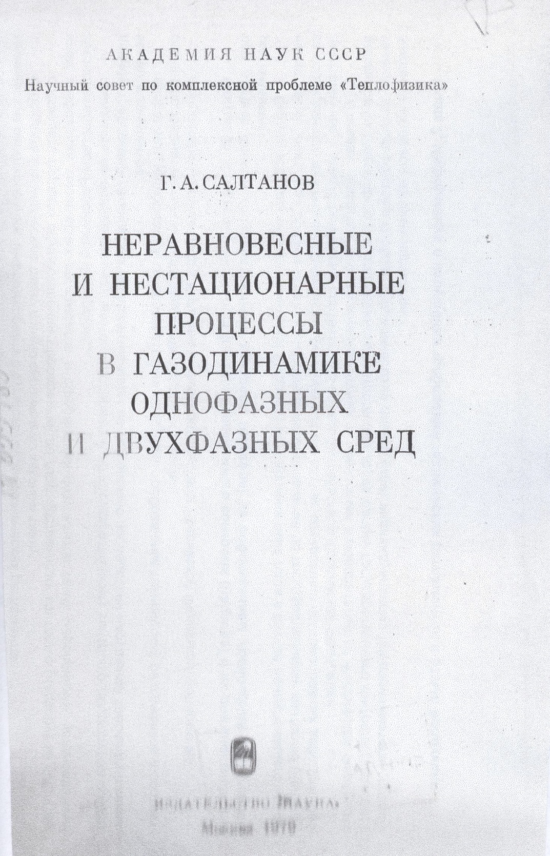 В 1979 г. в издательстве «Наука» публикуется персональная монография Г.А. Салтанова «Неравновесные и нестационарные процессы в газодинамике» (рис.8). Предложения об издании этой книги рассматривались в 1978 году на заседании Научного Совета по комплексной проблеме «Теплофизика» АН СССР, были одобрены и поддержаны председателем Совета академиком Стыриковичем М.А.