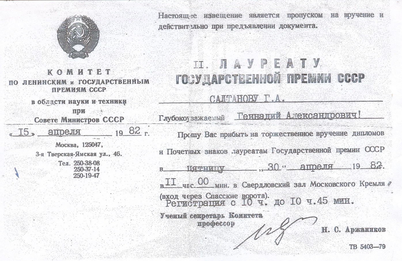 Рис 12. Приглашение в Кремль на вручение лауреатского диплома