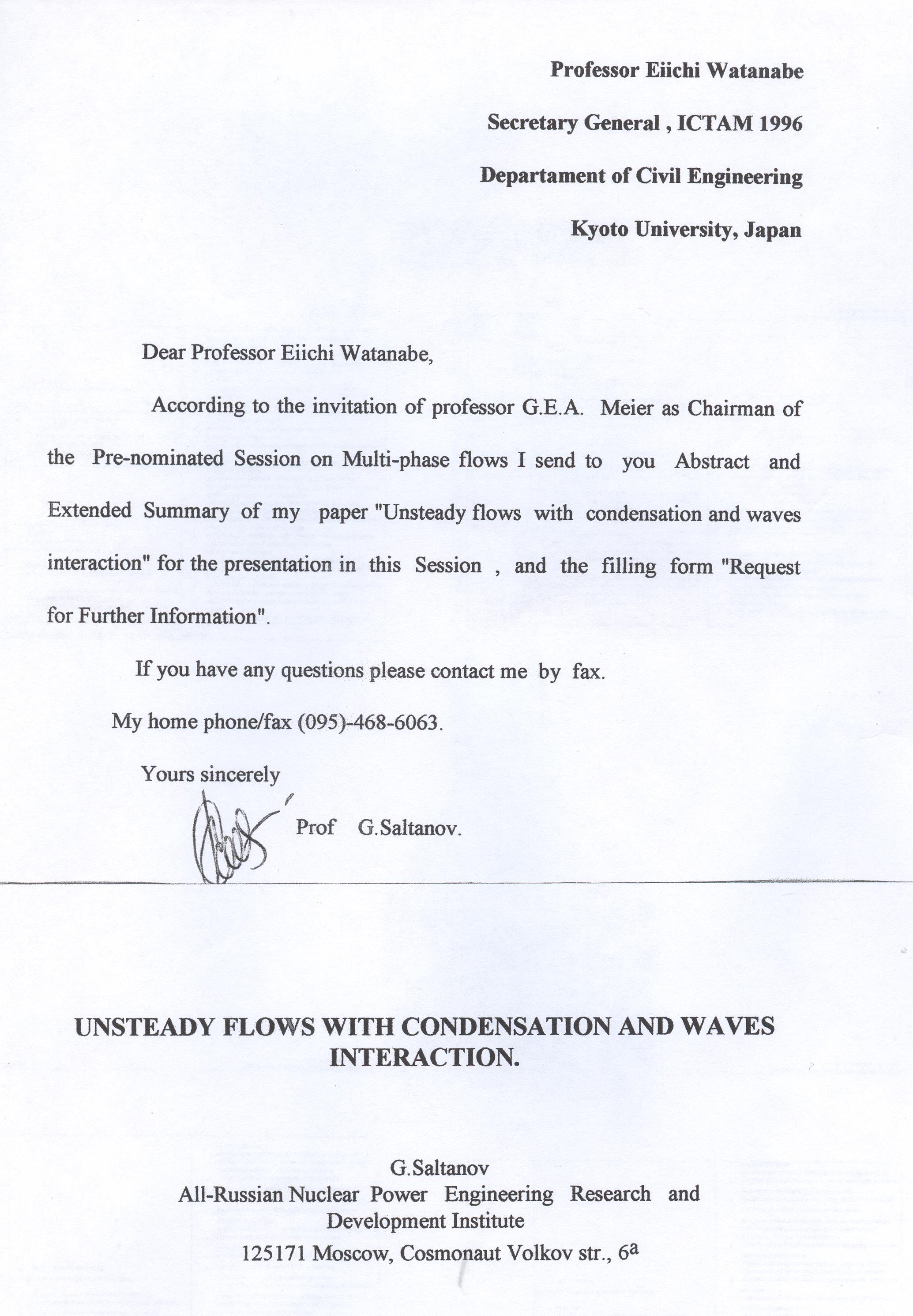 Последовали другие персональные приглашения. Так, с подачи профессора Мейера, (моего коллеги из Карлсруэ), от Генерального секретаря Международного конгресса теоретической и прикладной механики (ICNAM) профессора Ватанабе, приглашение на 19-й Международный конгресс в Киото, Япония в августе 1996 года. После переписки направил доклад по теме конгресса, базирующейся на результатах практики «ННПГ» (рис. 14).