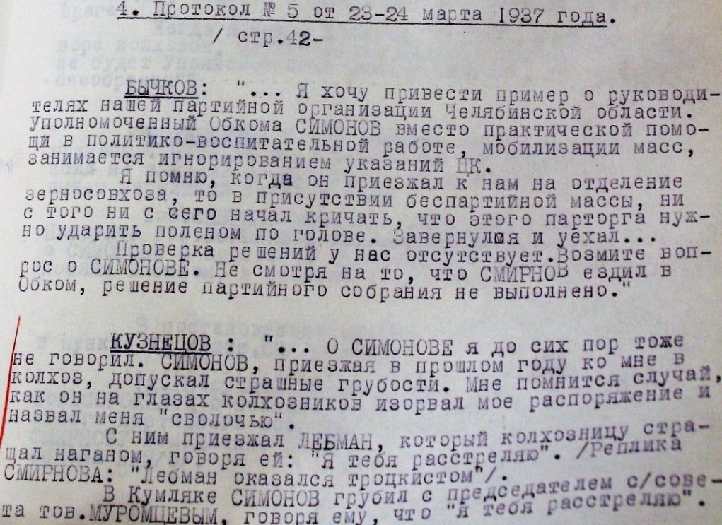 Выяснилось, что благодаря своей политической беспечности проглядели извращения закона о зернопоставках осенью 1936 года. Специальной проверкой комитета заготовок СНК установлено, что в нарушение этого постановления в Покровском, Тугулыкском, Талицком и Камышловском районах Челябинской области было проведено изъятие зерна у колхозников, выполнивших полностью все свои зерновые обязательства перед государством. Враги народа – бывший уполномоченный комитета заготовок по Челябинской области Зыков и начальник зернового управления Орлов организовали вредительство путем изъятия зерна у колхозников, полностью