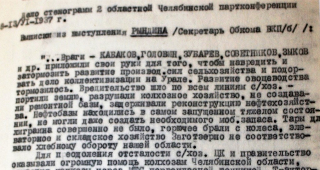 «… Враги – Кабаков, Головин, Зубарев, Советников, Зыков и другие приложили руки для того, чтобы навредить и затормозить развитие производительных сил сельского хозяйства и подорвать дело коллективизации на Урале. Развитие овощеводства тормозилось. Вредительство шло по всем линиям сельского хозяйства – портили землю, разрушали колхозное хозяйство, не создавали ремонтной базы, задерживали реконструкцию нефтяного хозяйства. Нефтебазы находились в самом запущенном тяжелом состоянии, не могли даже создать необходимого мобилизационного запаса. Складское хозяйство, заготзерно не соответствовало хлебному обороту нашей области.