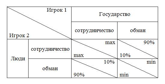 Если представить, что государство и люди играют друг с другом, то, как видно из матрицы выигрышей, государство, применяя стратегию обмана (капиталистическое государство), как раз и выигрывает в соотношении 90/10 у большинства людей, которые применяют стратегию сотрудничества (то есть живет по законам государства).